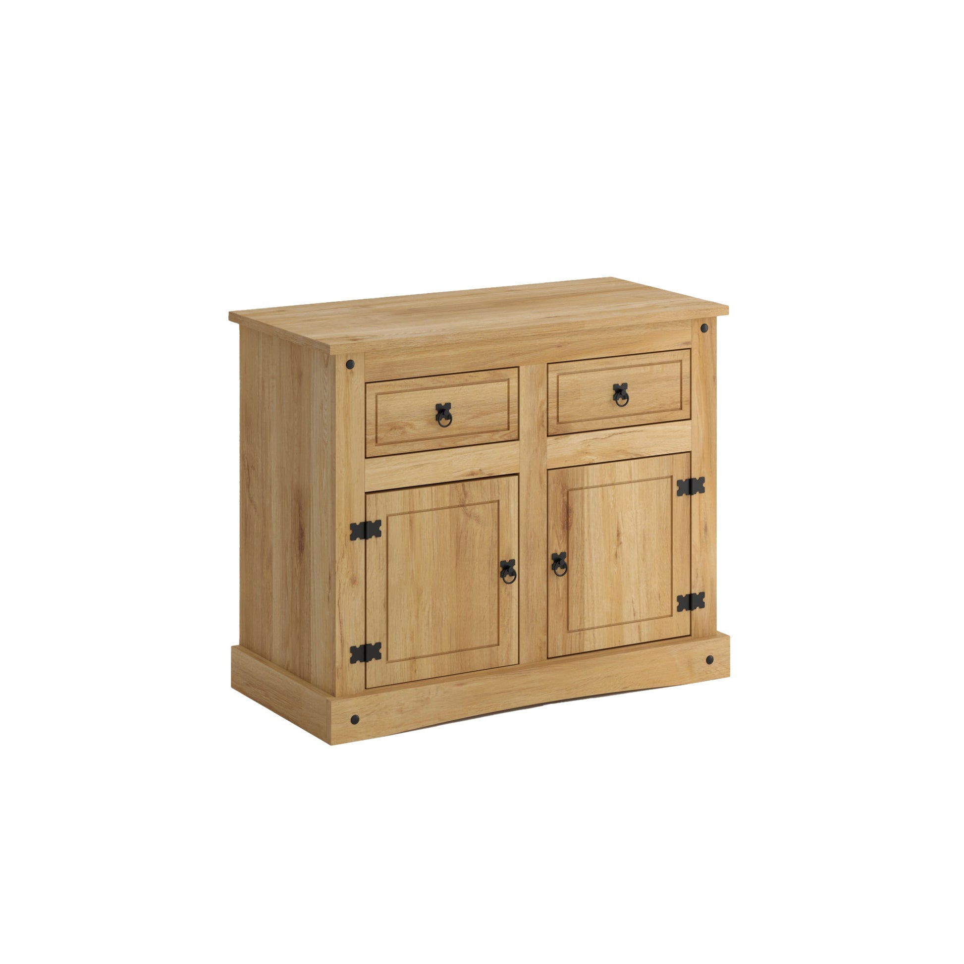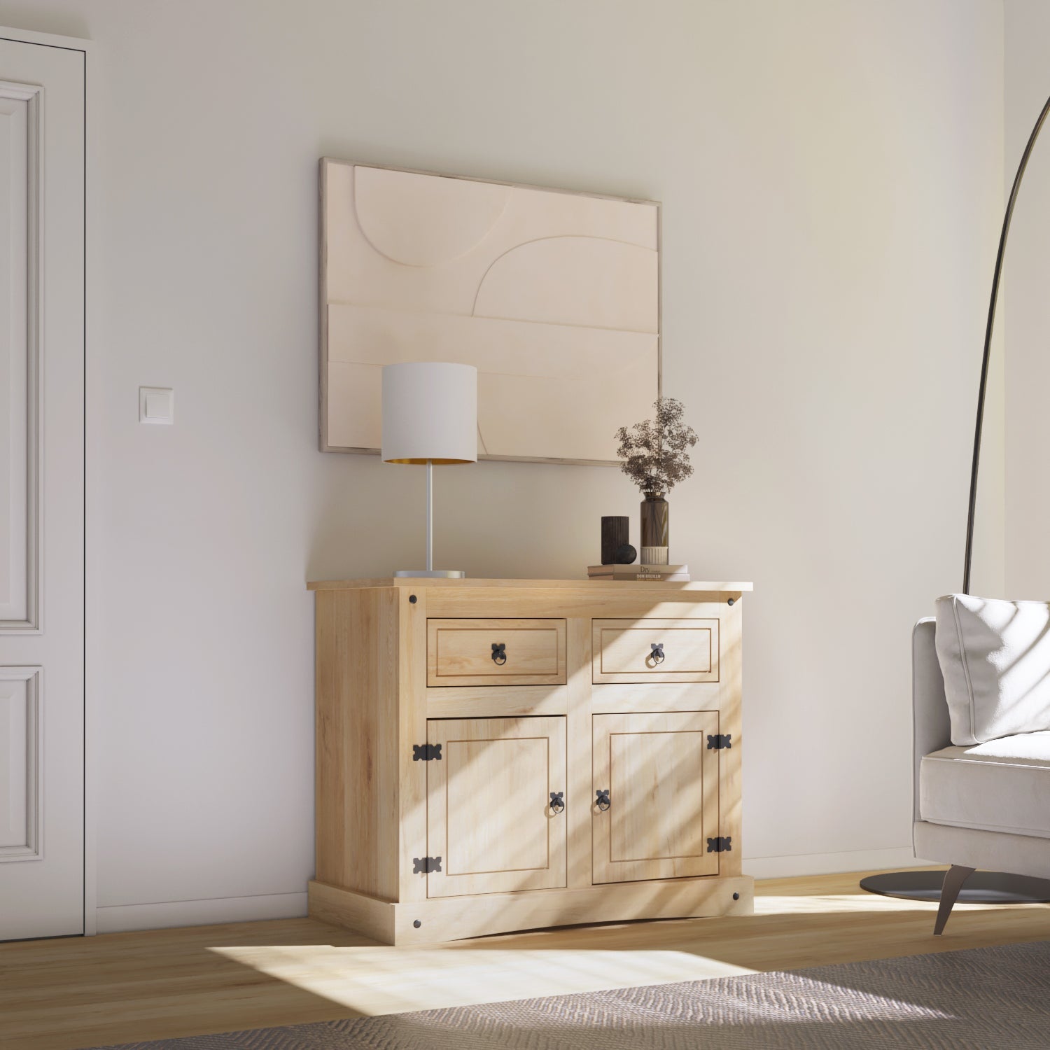 Este aparador de dos puertas y dos cajones ofrece un aspecto moderno y duradero. El color de madera natural añade un toque rústico a tu decoración. Perfecto para espacios reducidos.