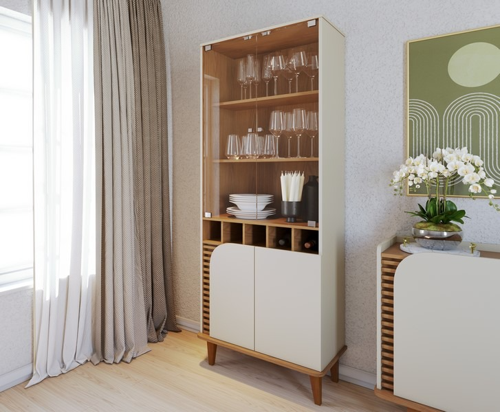 Cristalero Jureré con 2 puertas de vidrio y bodeguero. Color Freijó con off white