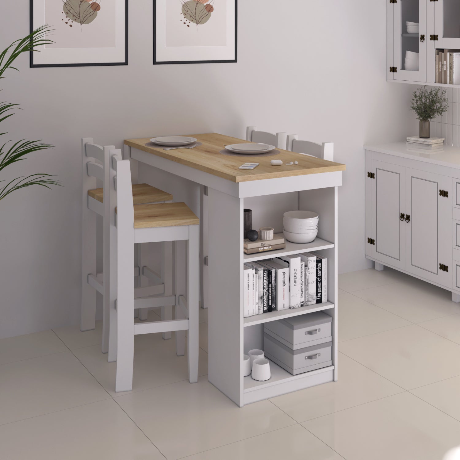 Disfrute de un desayuno cómodo y moderno con el Desayunador 4 banquetas - blanco. Con sus 4 banquetas y estilo contemporáneo, este desayunador le ofrece la comodidad ideal para compartir con la familia. ¡Prepare desayunos deliciosos y disfrute!