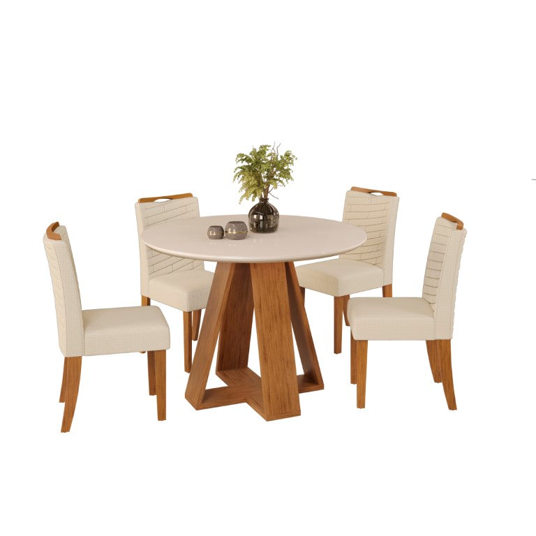 ¡Resalta tu sala con el Elegante Juego de Comedor Redondo - Celeste de Freijo y Off White! Esta hermosa mesa está parcialmente hecha de madera Freijo y es perfectamente complementada con 4 sillas de madera Off White. Su diseño moderno y elegante aportará a tu hogar un espacio sofisticado.