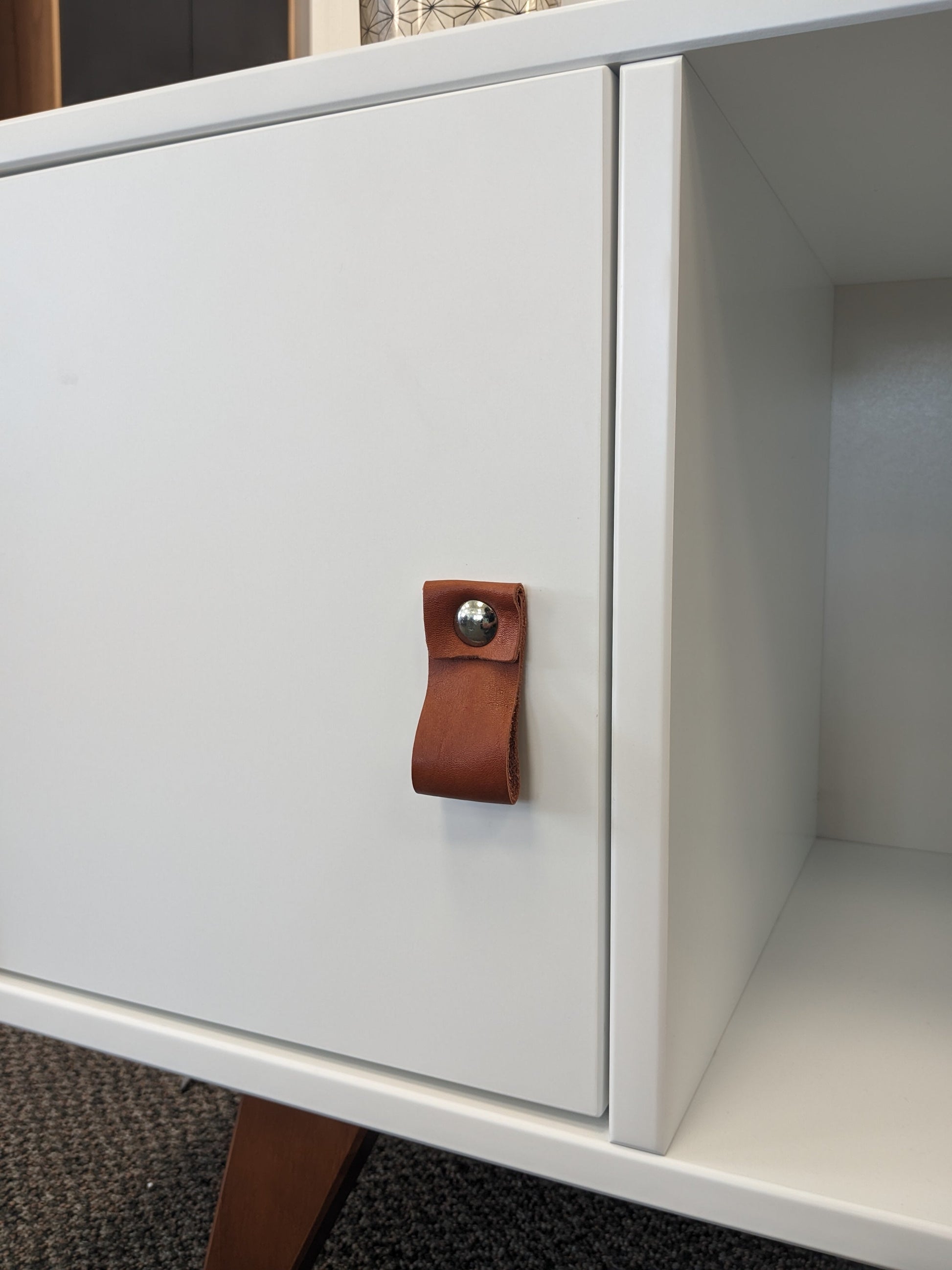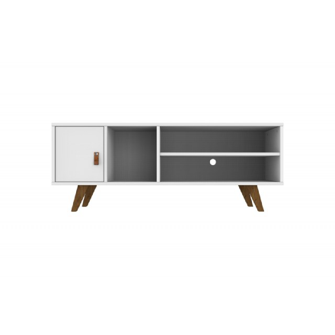 Rack TV Sancho color blanco, terminaciones simil cuero 1 puerta, 3 Estantes.
